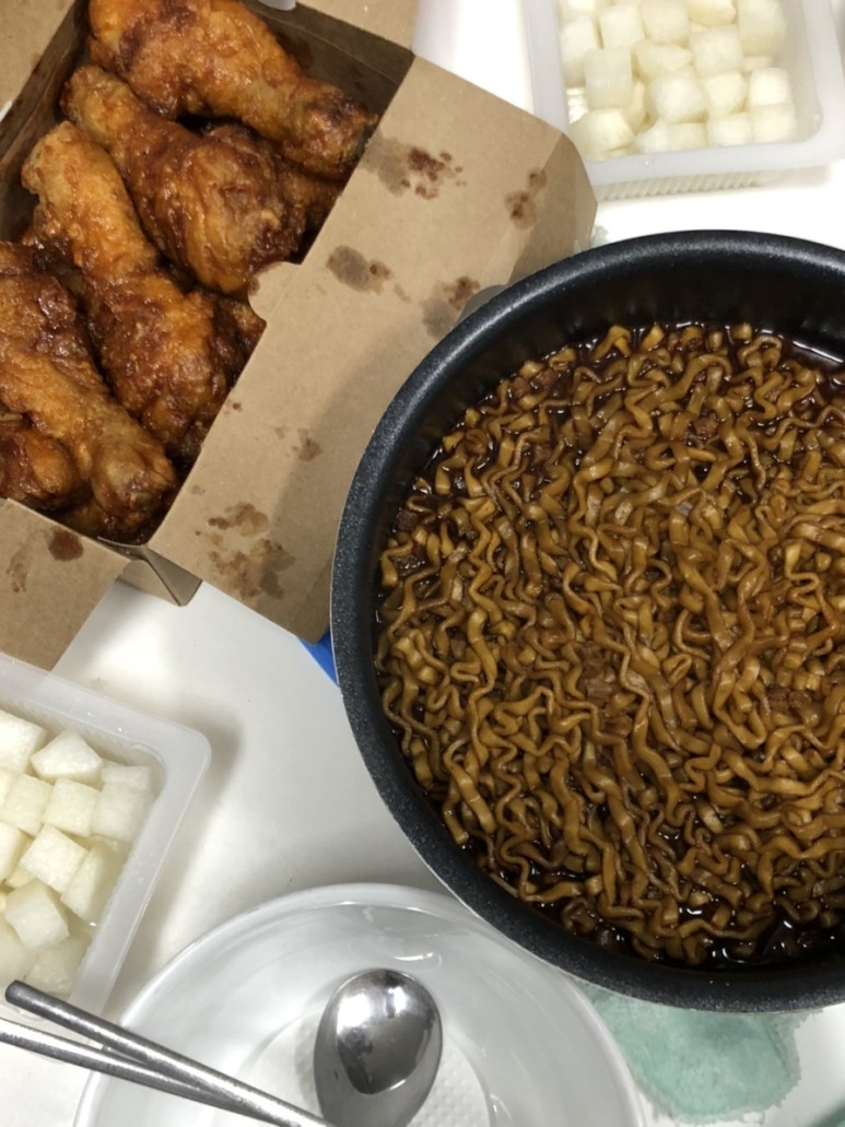 친구와 둘이 오뚜기 진진짜라 3봉지와 치킨을