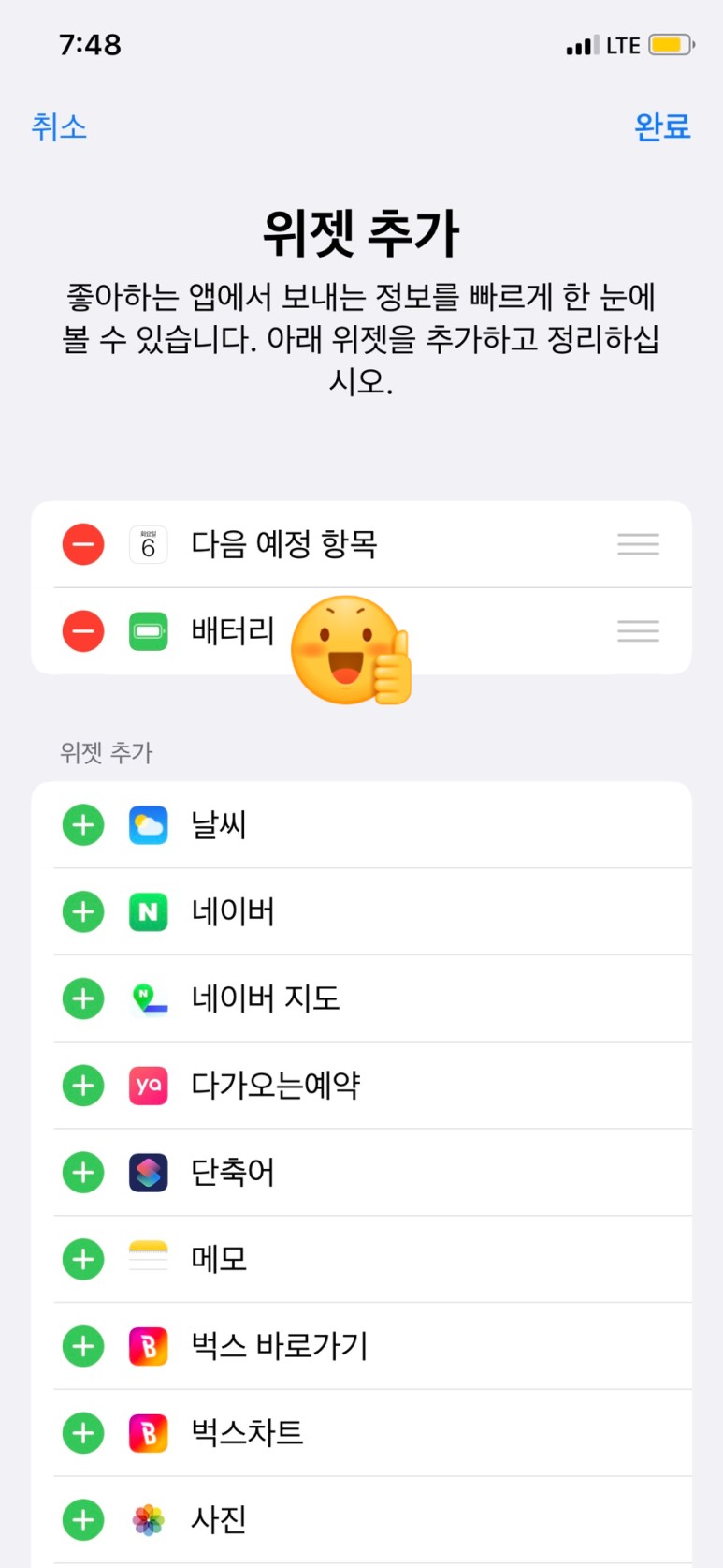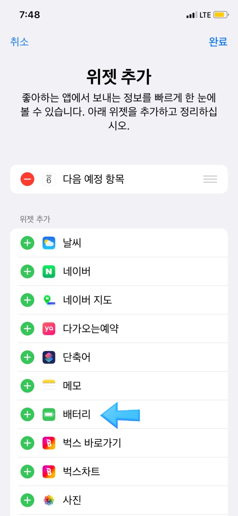 '위젯 추가'라는 화면으로 바뀌고 여러 항목 중