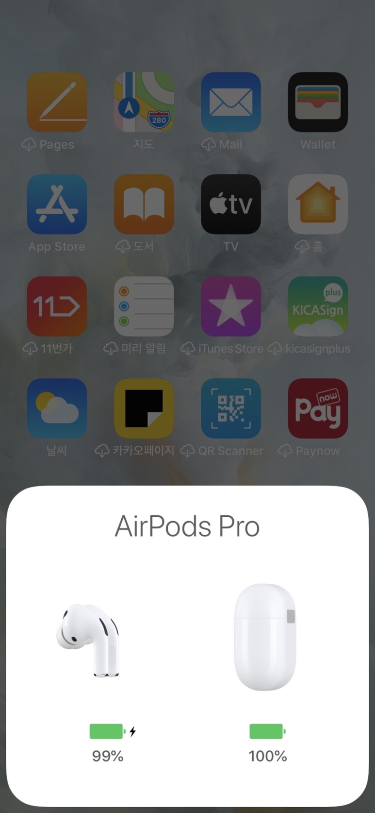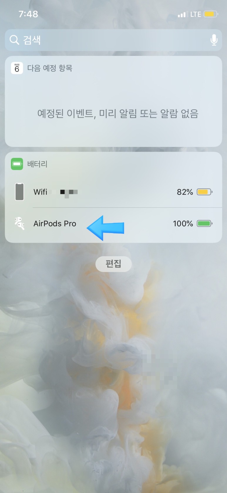 그 이후 홈화면에서 다시 왼쪽으로 오른쪽으로 터치를 밀면 핸드폰과 에어팟 프로 배터리 상태를 확인할 수 있다