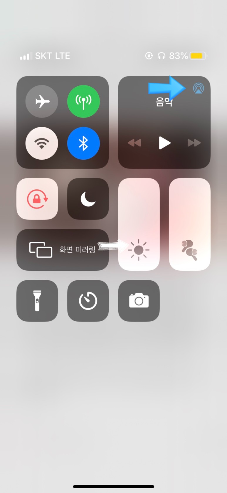 첫 번째는 아이폰 홈 화면에서 오른쪽 상단 맨위를 아래로 끌어 내리면 위에 사진과 같은 화면이 뜬다