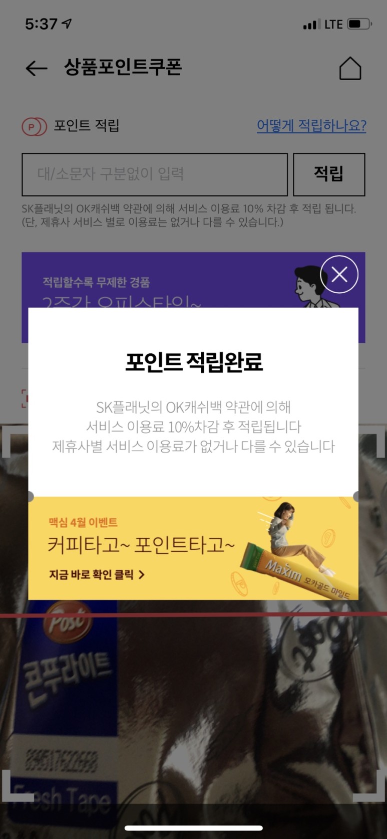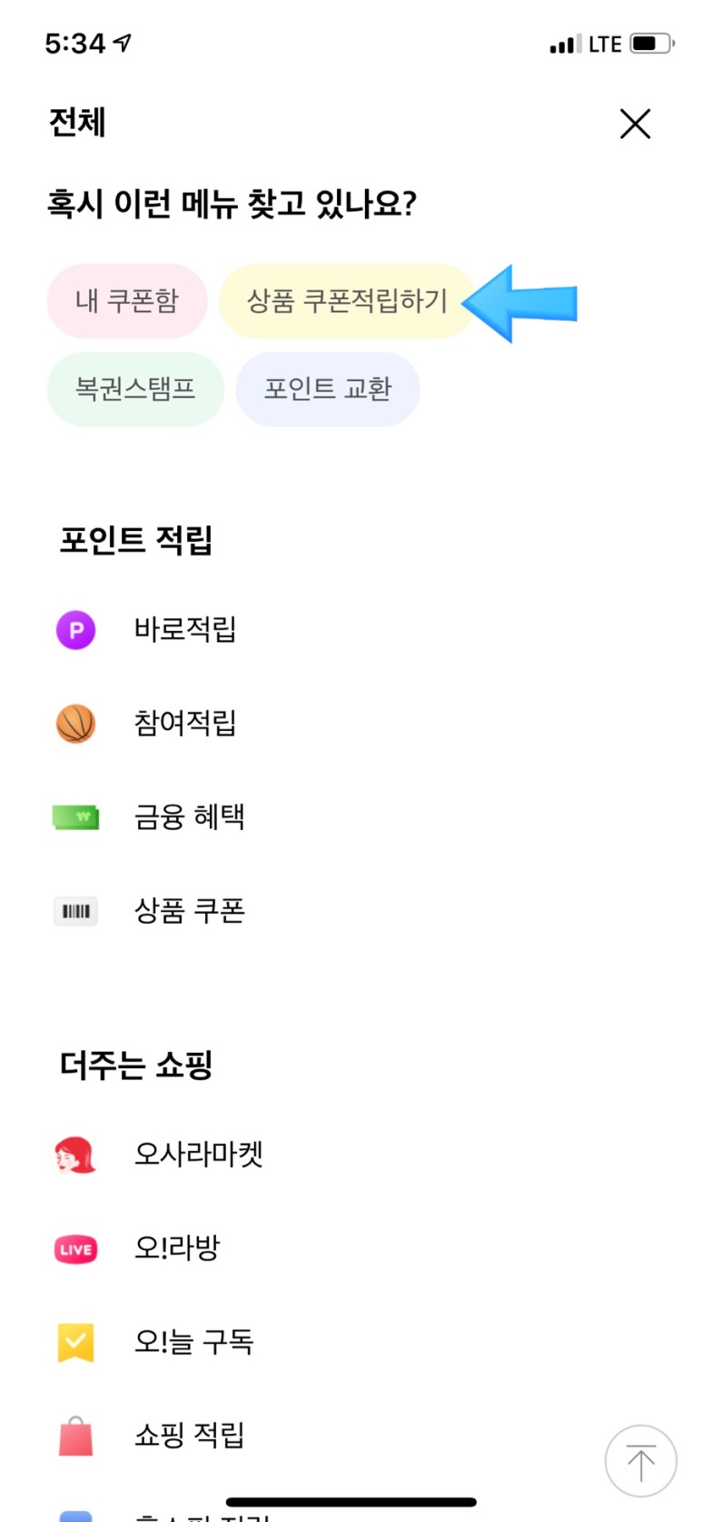 상품 쿠폰적립하기를 터치하면 이렇게