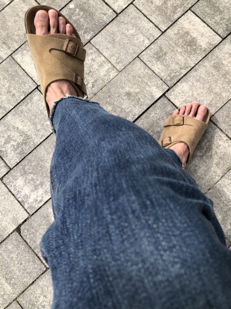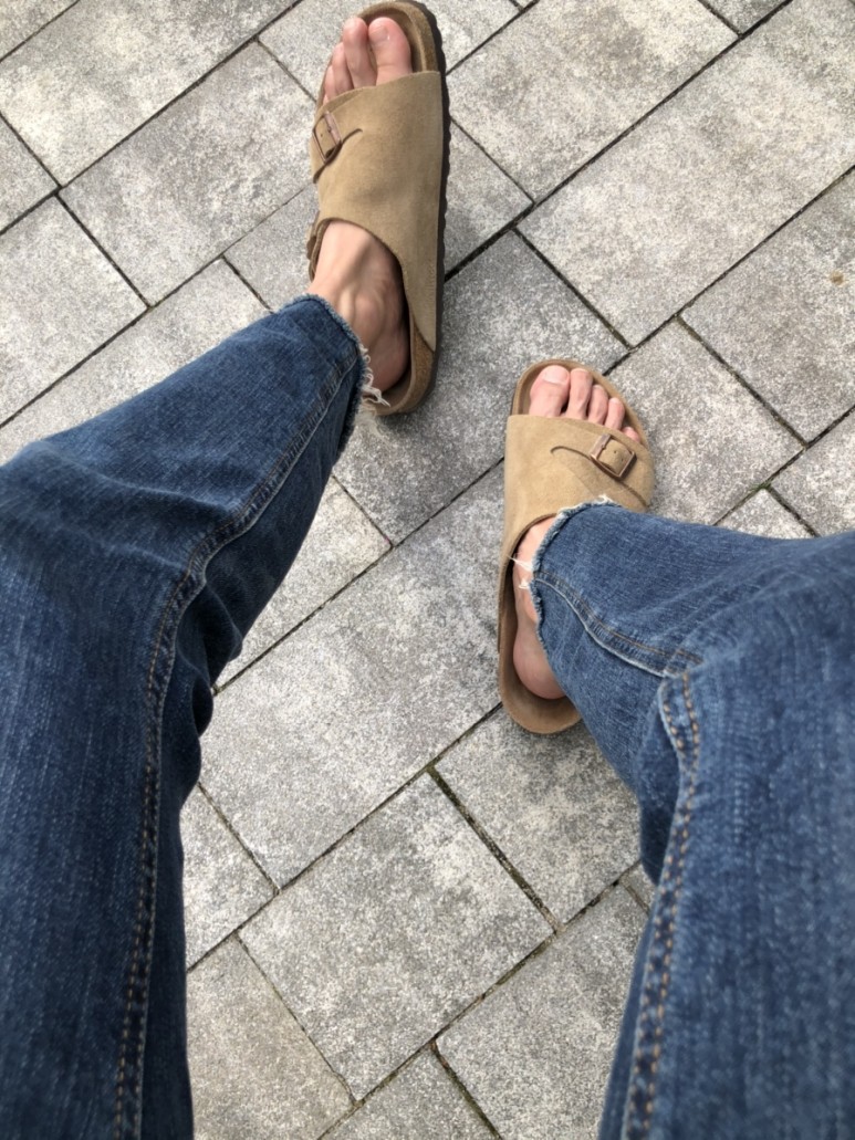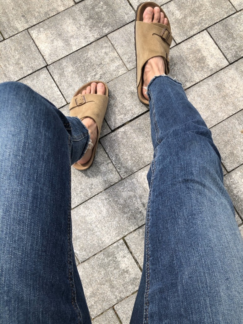 스웨이드 소재의 샌들이 청바지와 만났을 때